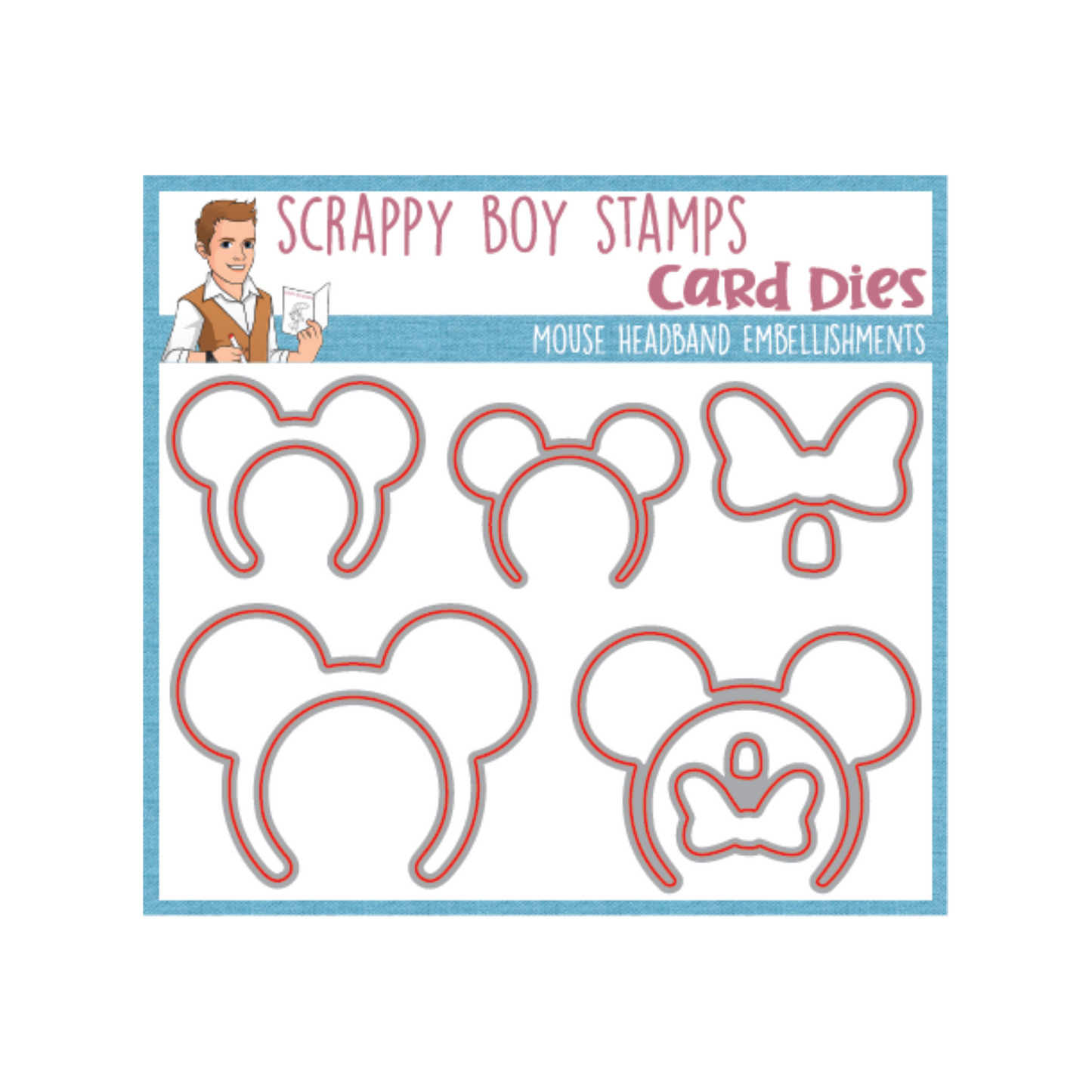 Mouse Headband Embellishments Die Set was designed by Nicole Silhouette exclusively for Scrappy Boy Stamps. Use these adorable dies to embellish mini albums, scrapbook pages and cards!