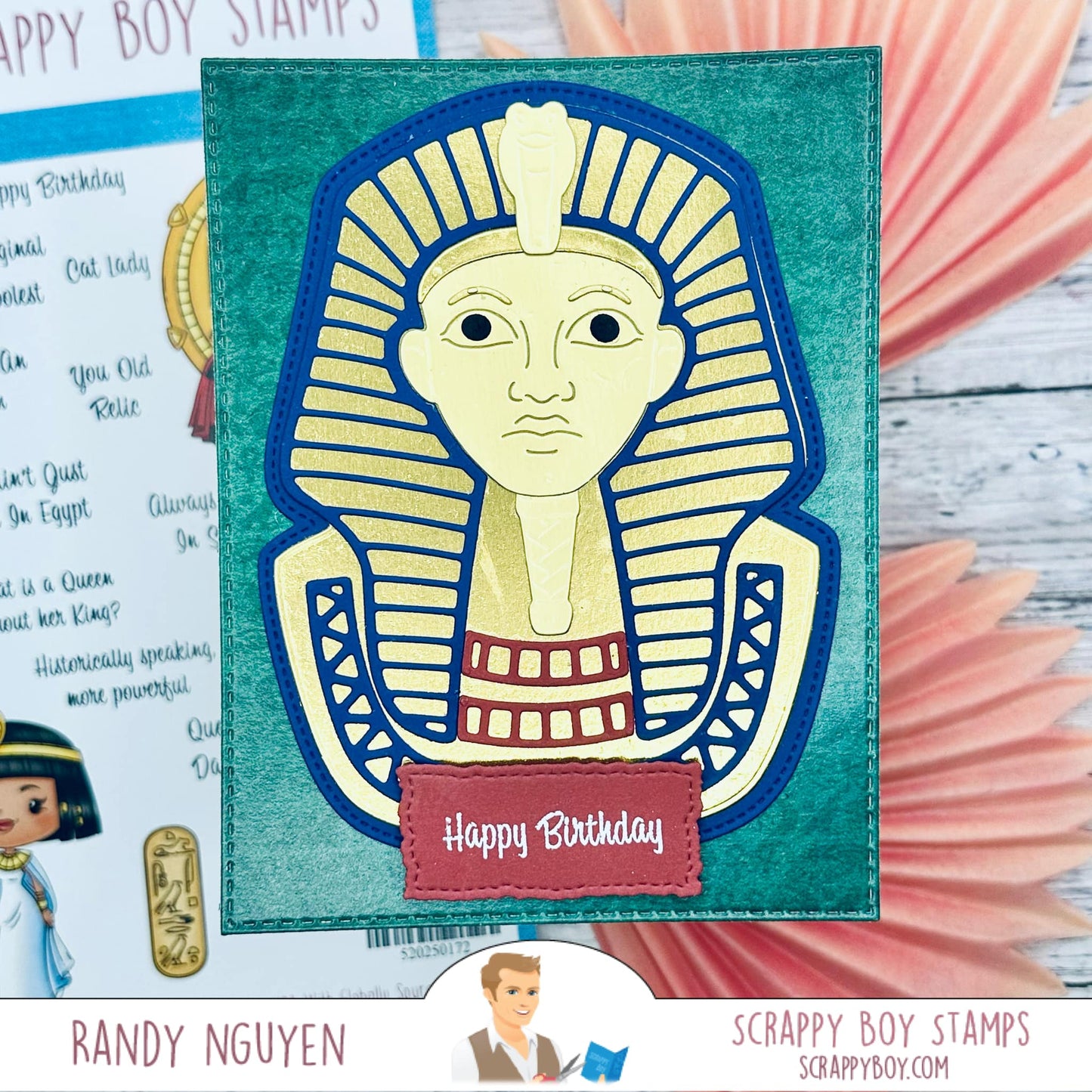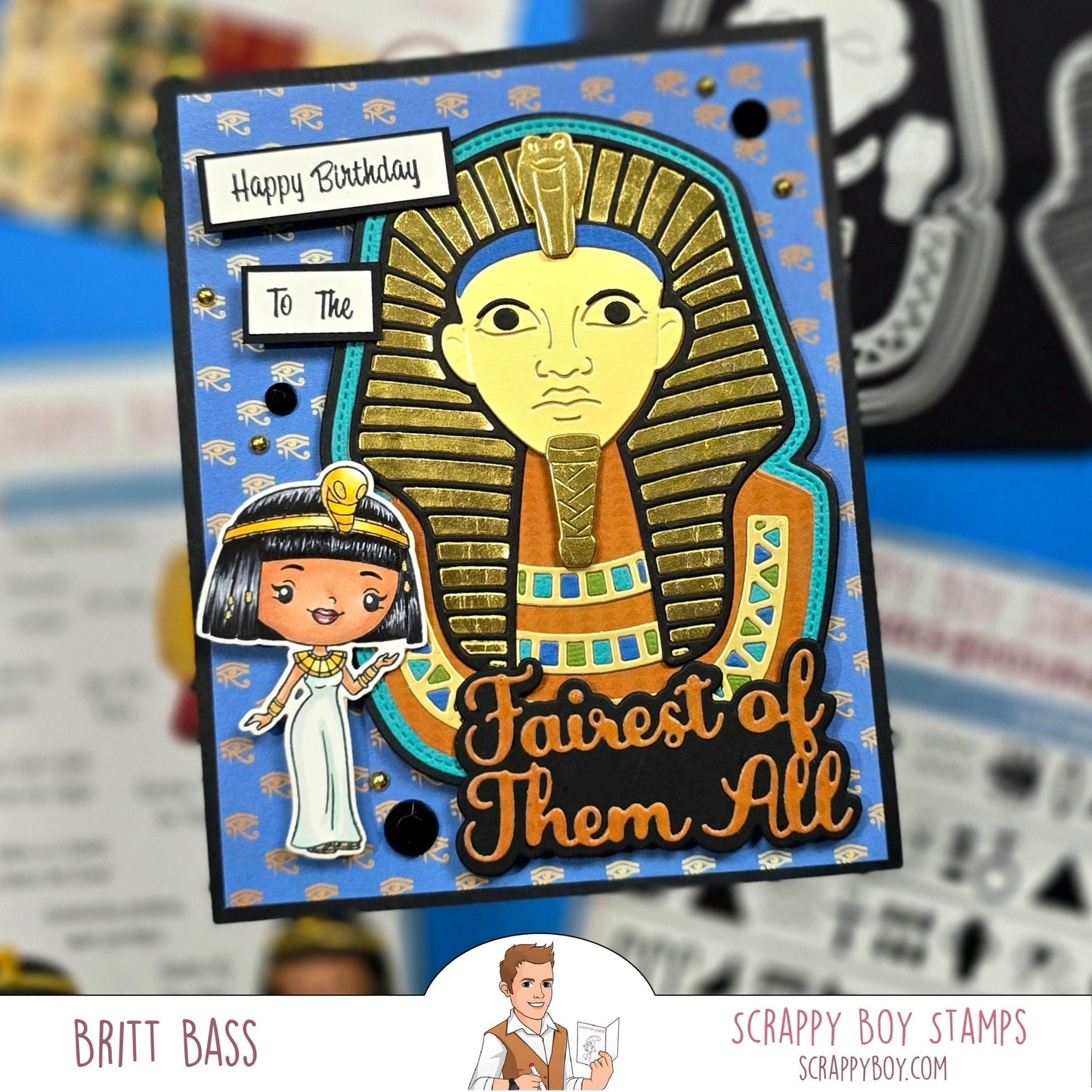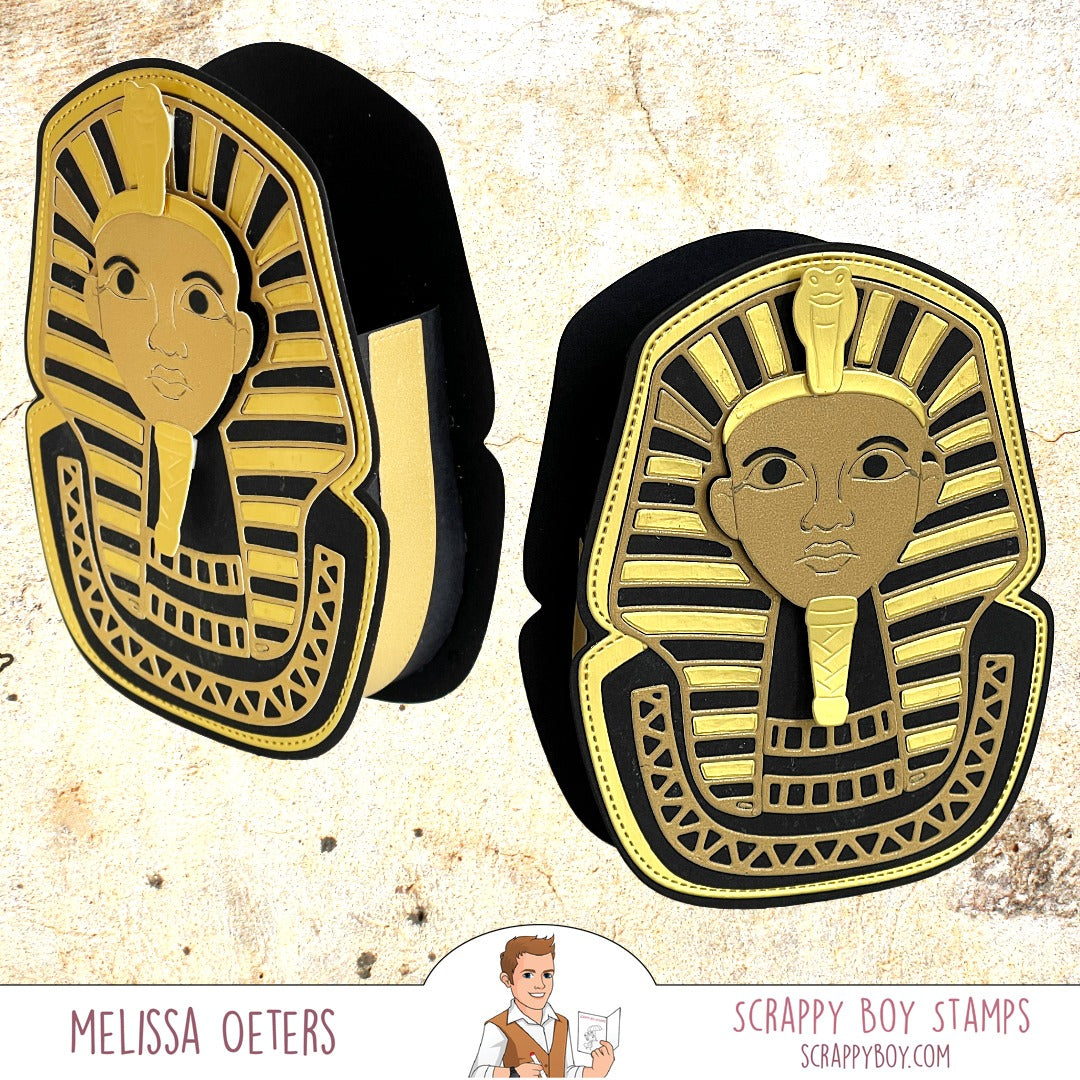 Egyptian Mask Card - Mini Album Die is a 12-piece die set designed by Nicole Silhouette for the Cleopatra Release. The finished size of the mask is just over 3.75" wide x just over 5" tall and fits in an A2 envelope.