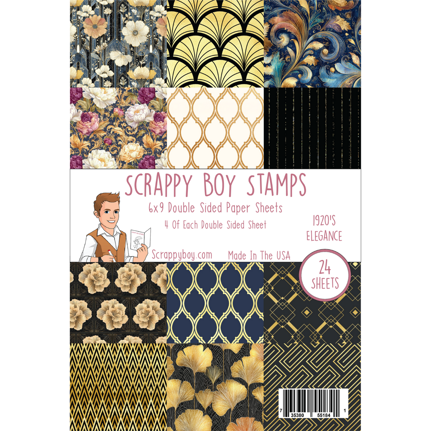1920's Elegance 6x9 Paper pack coordinates with the Noble Traditions release. You'll receive 24 sheets of 6x9 double-sided paper. There are 4 sheets of each piece.