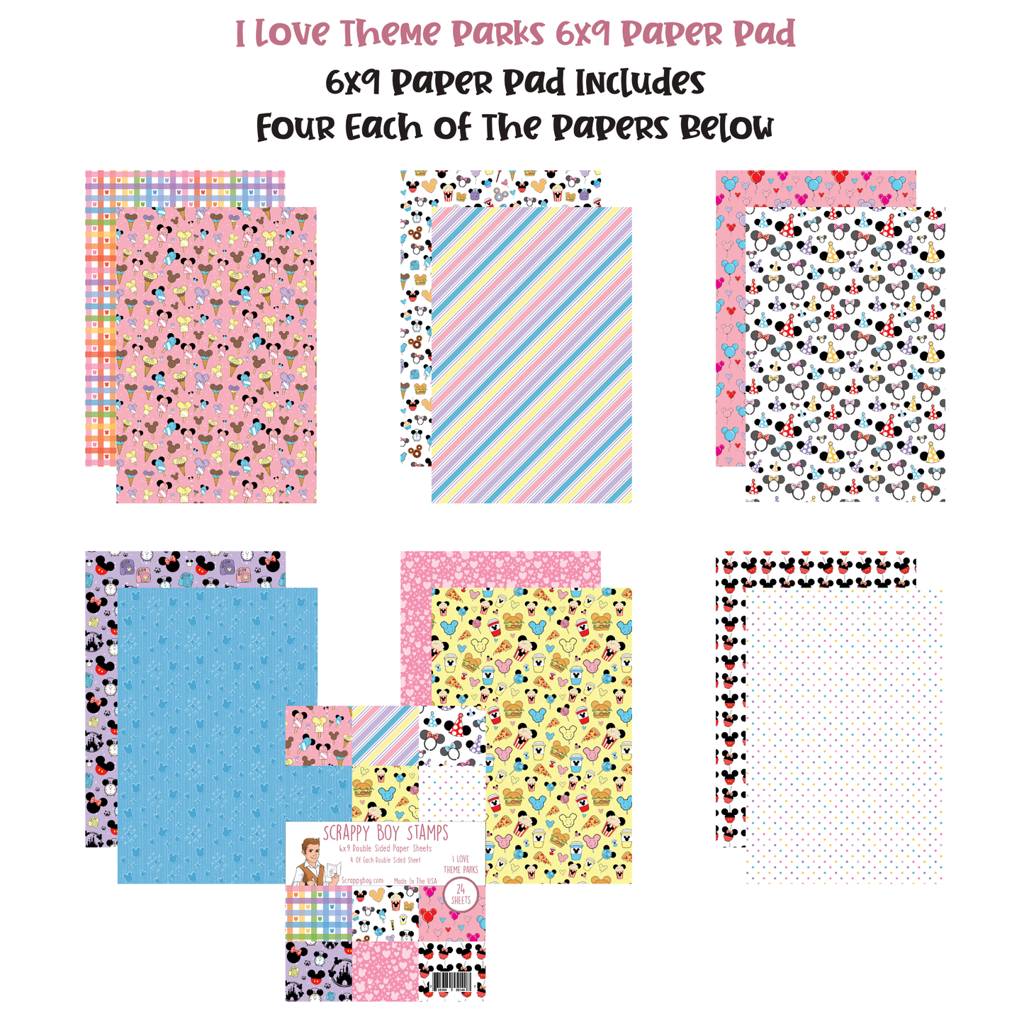 I Love Theme Parks 6x9 Paper pack coordinates with the Cute Kids Theme Park release. You'll receive 24 sheets of 6x9 double-sided paper. There are 4 sheets of each piece.